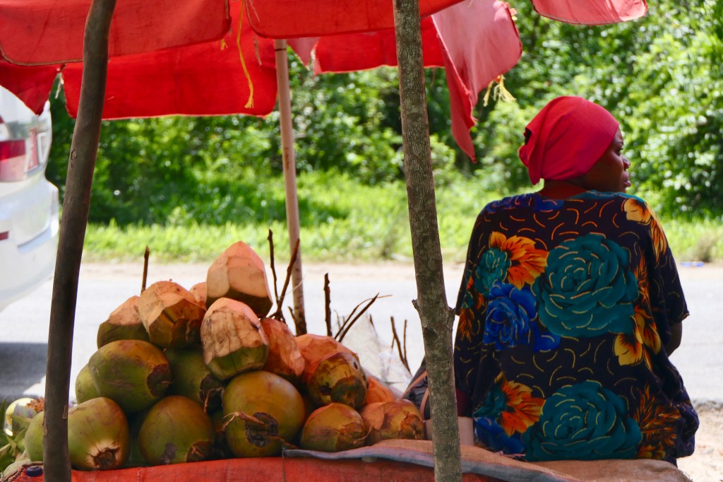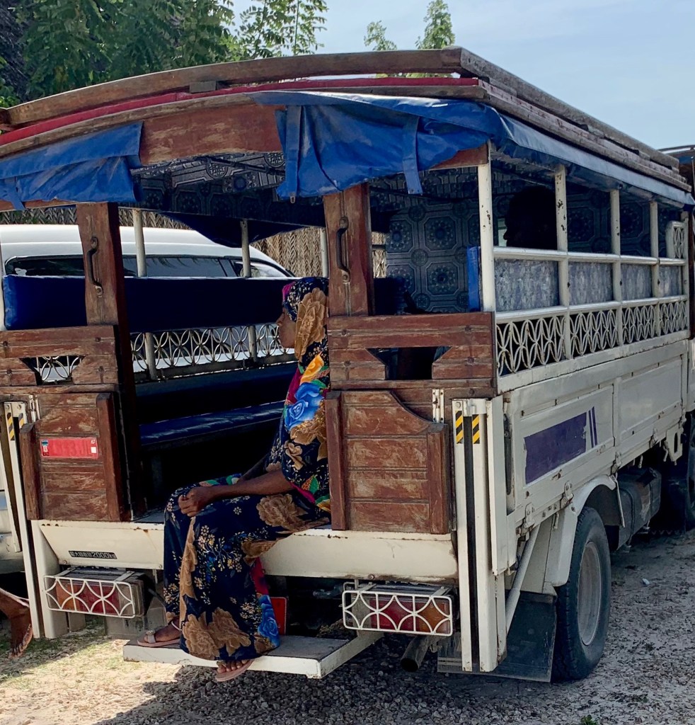 A messzebbre igyekvők a helyi iránytaxikat használják. Ezek a nyitott oldalú, harsány színekre festett járművek meghatározott útvonalon közlekednek, és pár fillérért elviszik az őket leintő utasokat. Valamennyi zsúfolásig tele volt emberekkel, a tetőkön pedig egymás hegyére-hátára kötözött kosarakat, ládákat, tyúkketreceket láttunk, sőt az egyiken bádog lavórokban hatalmas kardhalakat is felfedeztünk, közvetlenül egy zsák ananász mellett 🙂
