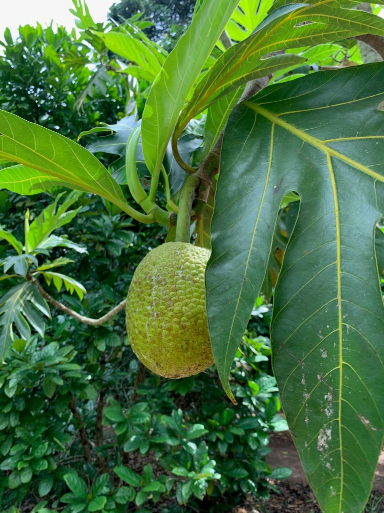 Na de térjünk még vissza egy kicsit a növényekhez. Elsétáltunk néhány, hatalmas piros fürtöket termő banánpálma alatt, aminek szép bordó virágát, Ázsiával ellentétben itt nem fogyasztják, láttunk égig érő kenyérfát, melynek gyümölcsének íze sütve/főzve emlékeztet a kenyérére, a zöld papayáról, melyből a thaiok népszerű salátája készül megtudhattuk, hogy ha tengeri sün tüskéje megy a bőrünk alá, akkor a zöld papaya nedvét rácsöpögtetve meg lehet tőle szabadulni. Ezt egyszer feltétlenül kipróbálom 🙂