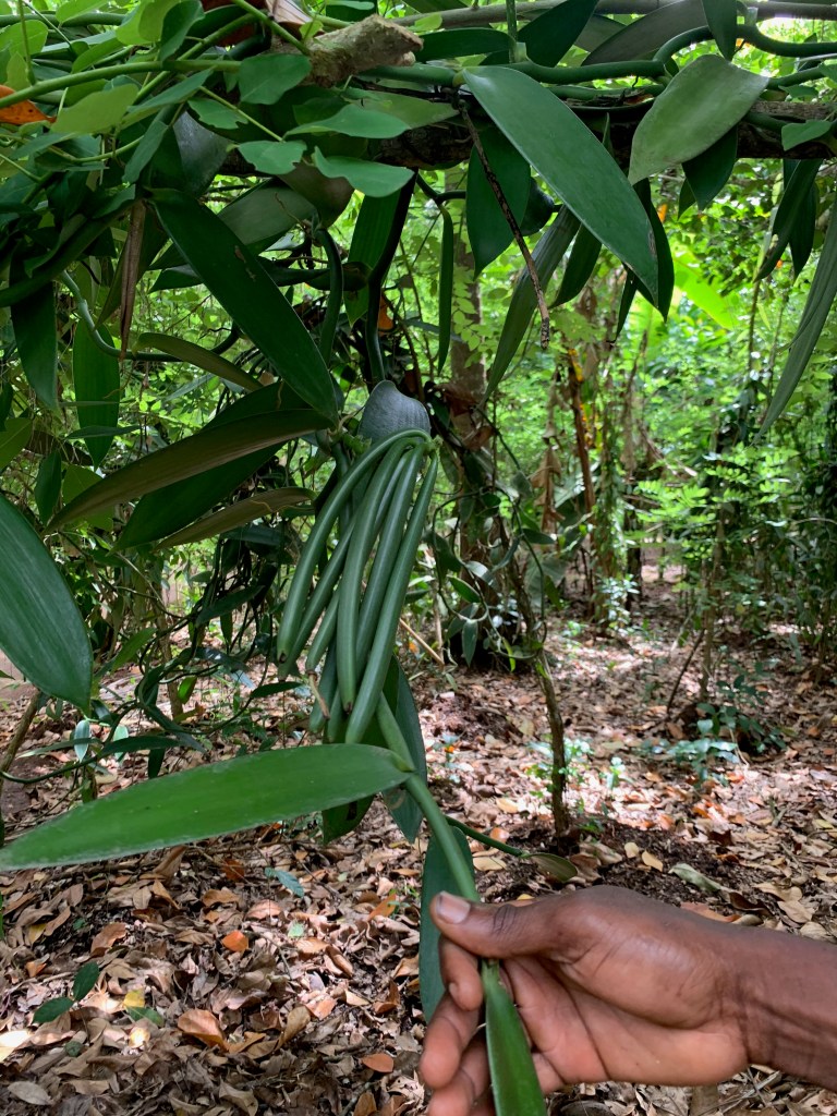 Ami nagyon érdekelt, az a vanília volt, aminek imádom az ízét és az illatát és fogalmam sem volt róla, hogy miért olyan értékes, hogy egykor még fizetőeszközként is használták. A lugasokra felfuttatott, fénylő sötétzöld levelű vaníliáról megtudtuk, hogy kúszónövény és az egyetlen orchideaféle, melynek fogyasztható a termése, valamint hogy évente csak egyszer virágzik és beporzását nagy szakértelemmel, kézzel végzik, utána speciális és időigényes szárítási folyamatokon megy keresztül, mielőtt a piacokra kerül. Mivel csak az egyenlítő körüli párás, trópusi éghajlaton terem és munkaigényes a feldolgozása, ezért hamisítják és szintetikus úton is előállítják a vanília aromáját. Az is új információ volt nekem, hogy a vanília ugyanannyira fontos parfümök adalékaként, mint kedvenc sütijeim ízesítőjeként.