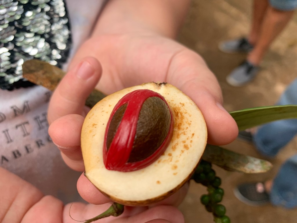 Körbejártunk egy szerecsendiófát, melynek csodaszép termésének mintha piros viasszal csíkozták volna be a magját, gyökere pedig állítólag a férfiaknak afrodiziákum, viszont a nőknek hallucinációkat okoz.
