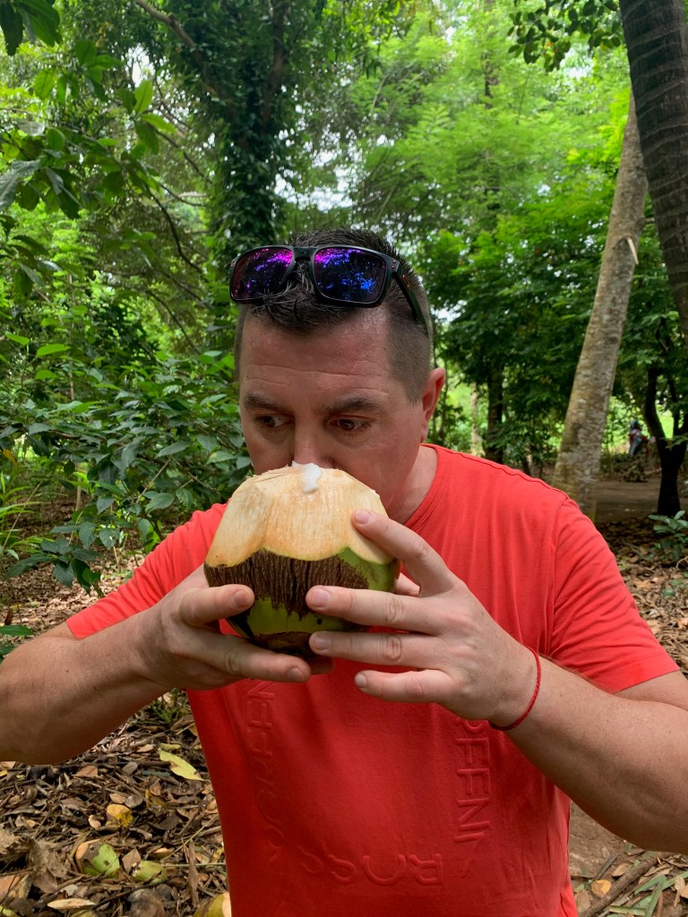Ezután friss kókuszlevet ittunk, amit közvetlenül a fáról szedett le nekünk egy macskaügyességgel mászó srác.