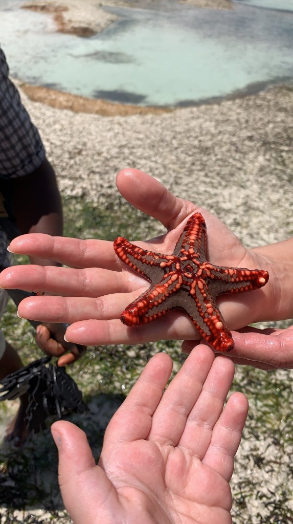Apály idején nagyokat sétáltunk a sekély vízben, de hiába kutattunk, csak homokra bukkantunk, egészen addig, míg egy helyi fiú elő nem varázsolta a rejtőzködő állatokat. Felkutatott nekünk néhány tűzpiros tengeri csillagot, egy gülüszemű gömbhalat, két hatalmas tüskéjű tengeri sünt és egy szivacsot, ami ha hozzáértünk ibolyalila tintát lövellt ki magából.