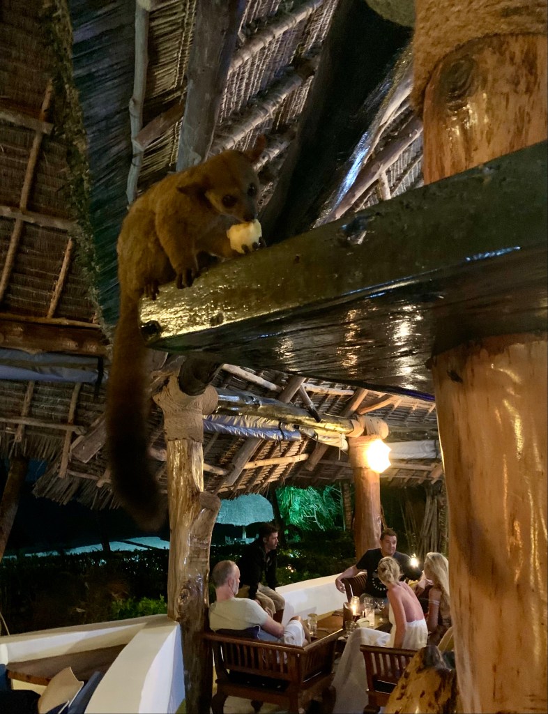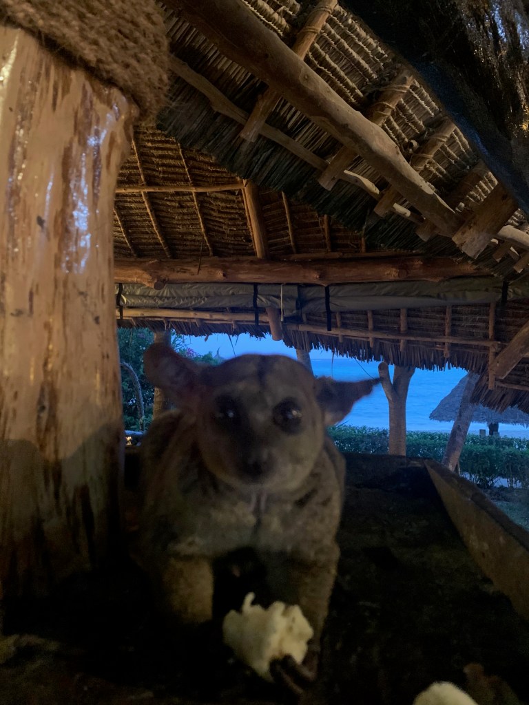 Talán a legnagyobb kedvencünk az itt élő maki család volt, akik óramű pontossággal jelentek meg vacsoraidőben az étterem kupolájának gerendáin és a bátrabbak szívesen elfogadták kezünkből a banánt. A gyerekekkel együtt teljesen oda voltam ezekért a mókás pofájú kis majmokért, akiket a helyiek bush baby-nek hívnak és a nagylányom szerint, aki hatalmas Star Wars rajongó, tuti hogy róluk mintázták Baby Yodát 🙂