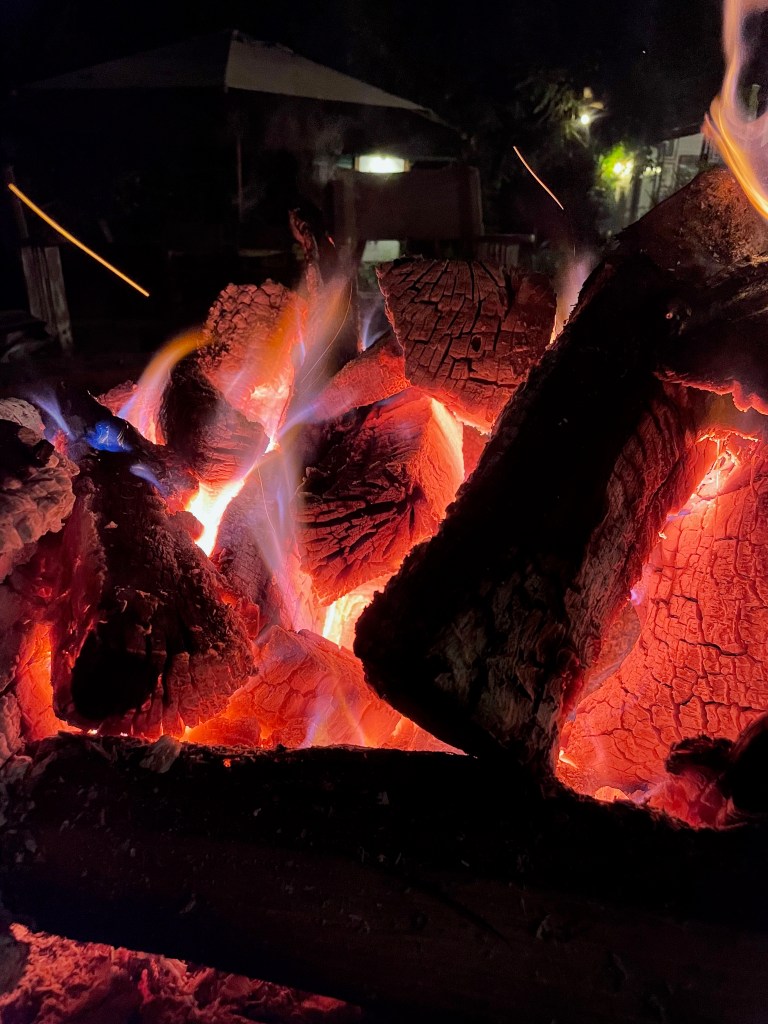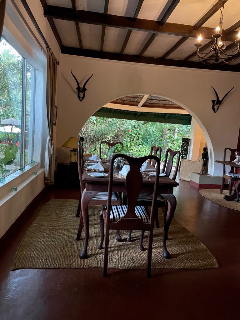 A kert szépséges fái alatt ülve csodáltuk a tavacskában lépegető gázlómadarakat,a pázsiton kergetőző majmokat és a méltóságteljesen vonuló pávákat. Isteni,egzotikus fűszerektől illatozó vacsorát kaptunk helyi sörökkel és jeges koktélokkal,a gyorsan lehűlő levegőt lobogó tűz melege tartotta távol,a lombok között felharsantak az éjjeli állatok kiáltásai.