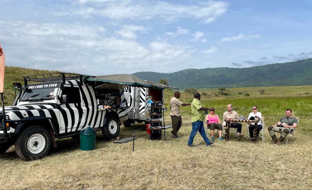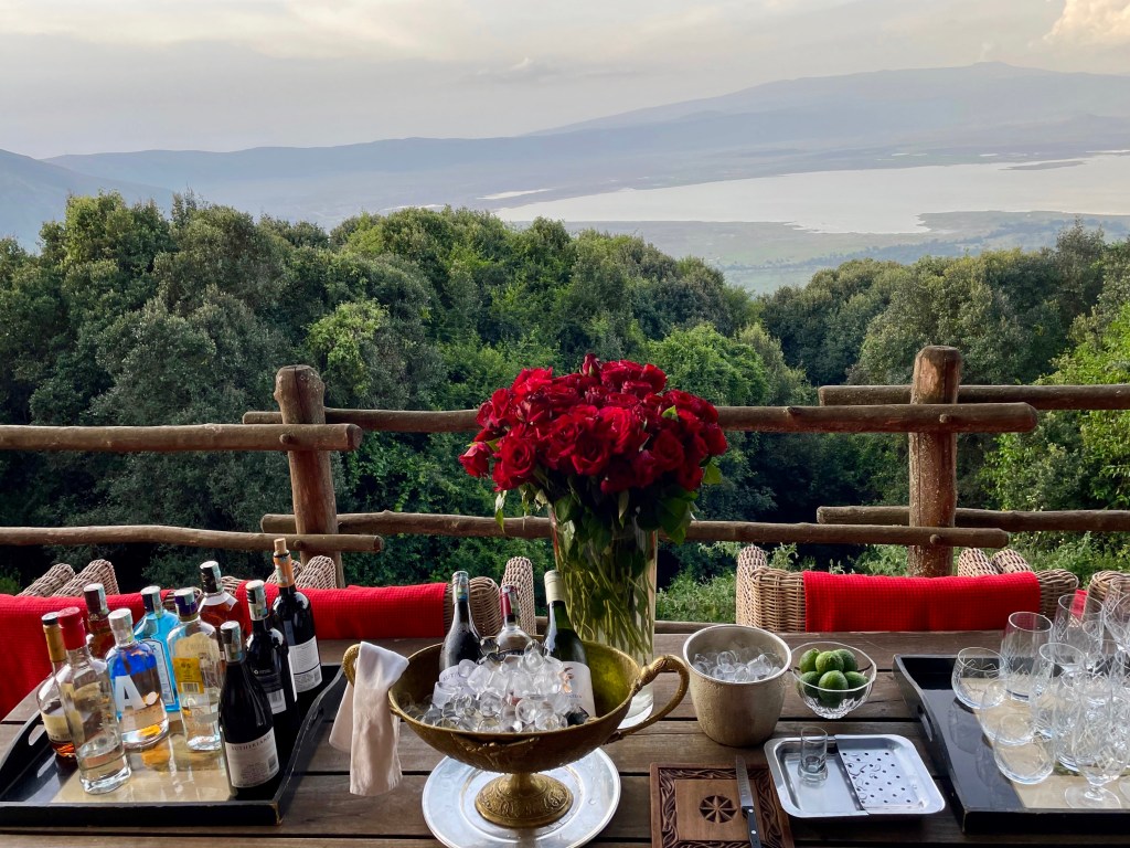 Sajnos indulnuk kellett kifelé, sötétedés előtt mindenkinek el kell hagynia a parkot. De nem bántuk, mert a kráter peremén álló hotelünk szobájának egyik fala padlótól a plafonig üveg volt, így az ágyból, a lábakon álló kádból, vagy akár a wc-ből is teljes pompájában láthattuk, hogyan nyugszik le a nap a Ngorongoro krátere mögött! Amíg forró fürdőt vettünk a virágszirmokkal telehintett kádban, addig a szobánkhoz tartozó személyi inasunk befűtött a kandallóba. Ezután golfkocsival fuvaroztak minket az étteremhez, nehogy az erre kószáló bivalyok kárt tegyenek bennünk. A teraszon élveztük ki a naplemente utolsó perceit, miközben saját pincérünk francia pezsgőt töltött kristálypoharainkba a kaviár mellé.