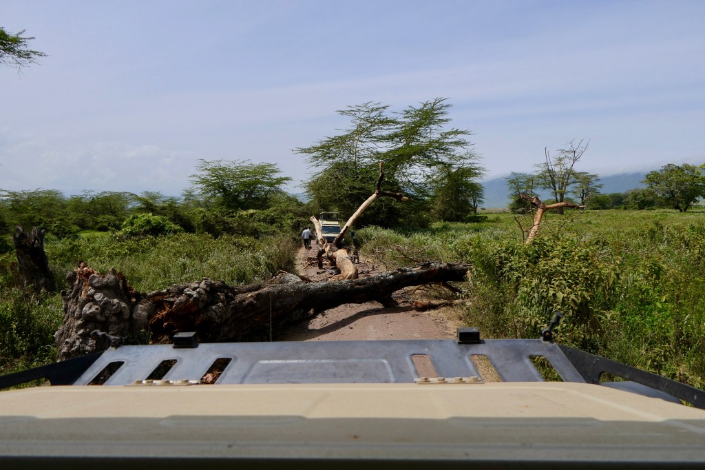 Alighogy leértünk a mélybe, meg is kellett állnunk, ugyanis egy kidőlt fatörzs zárta el az utat. Hamarosan szemből is érkezett egy autó, a két fekete vezető közösen törte a fejét, hogyan mehetnénk tovább. Nekünk sajnos tilos volt kiszállni, így csak a kocsiból figyelhettük az eseményeket.