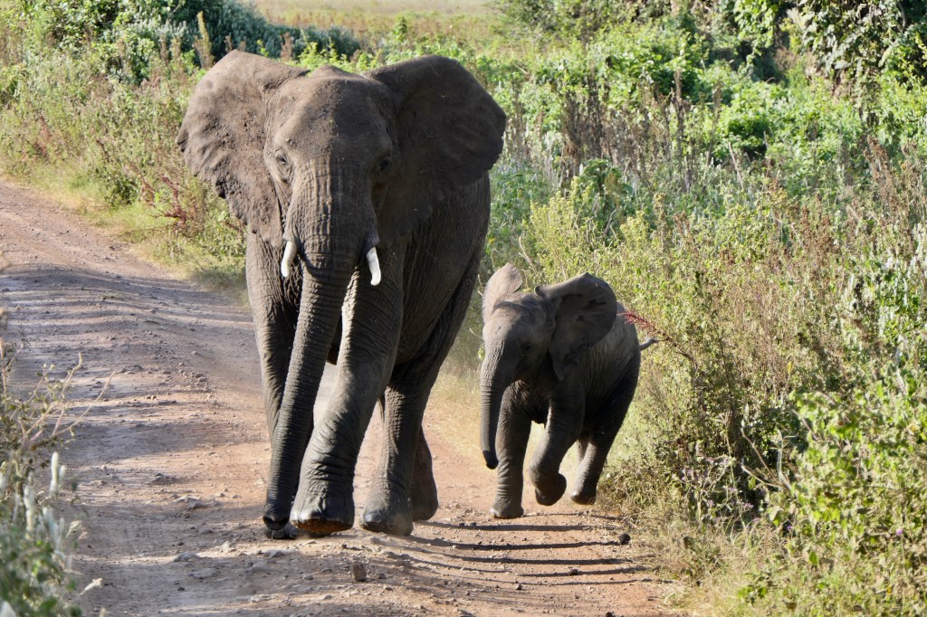 Egyszer csak az egyik anyuka a kicsinyével kijött az útra és széttárt fülekkel, dühödt trombitálással és fenyegető mozgással megindult felénk! Mondanom se kell, azonnal hátramenetbe kapcsoltunk! Az elefánt még pár lépést tett felénk, de mikor úgy érezte, hogy már biztonságos távolságra vagyunk a borjától, ment tovább a dolgára. Eléggé felszökött az adrenalin szintünk ettől a kis közjátéktól! Említettem már, hogy oda vagyok az elefántokért?!