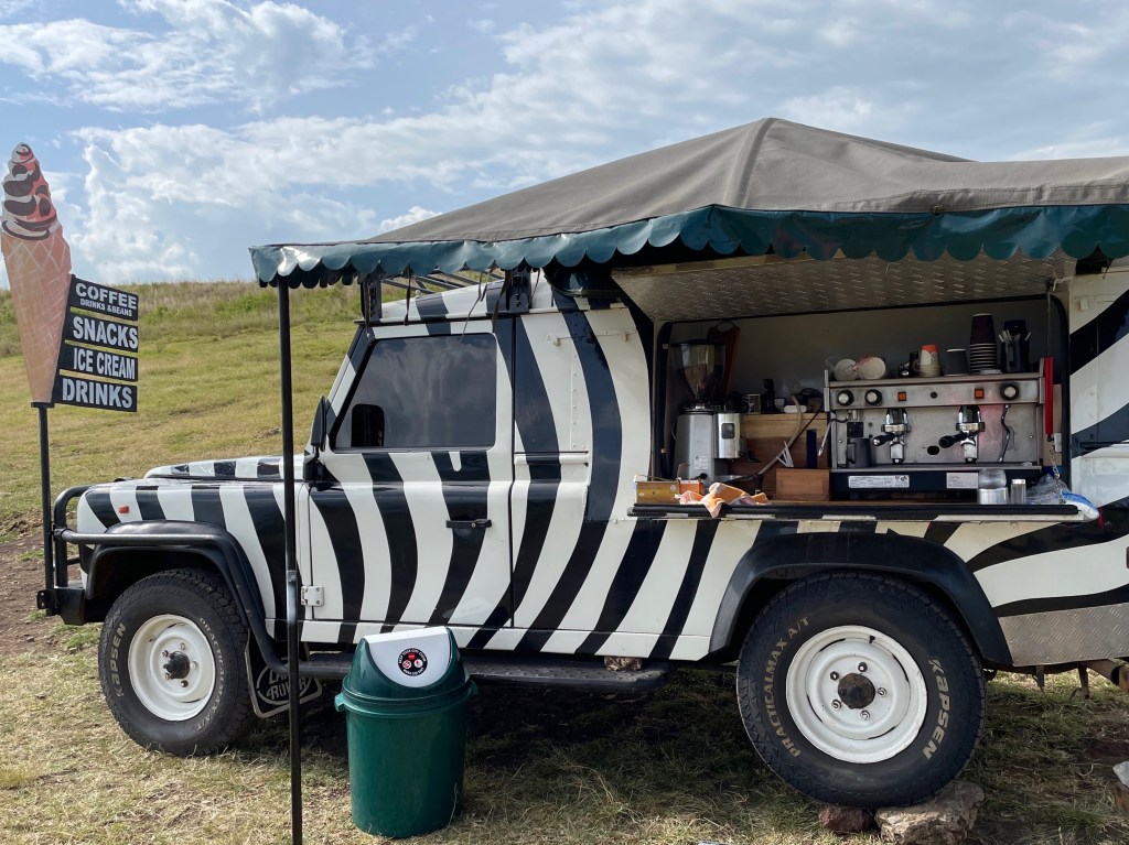 És ahogy itt sétáltunk, rátaláltunk a legmenőbb helyre, amit életünkben valaha láttunk! Egy dombocska tövében, a végtelen semmi kellős közepén állt egy zebracsíkosra festett kávézó! Teljességgel hihetetlen látvány volt a fekete-fehér jeep és a szavanna közepére gondosan kitett asztal négy székkel!