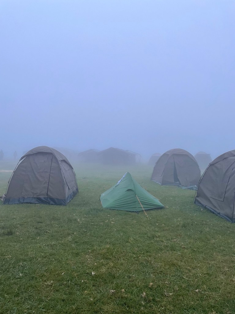 Korán bebújtunk a sátrunkba, mert elképesztő hideg volt! Magamra húztam az összes meleg ruhát, de még a dupla hálózsákban is vacogtam! Fagypont körül lehetett, aludni sem tudtam, annyira fáztam. Viszont így végighallgathattam, mi történik körülöttünk az éj leple alatt! Először a hiénák érkeztek, bejárták a területet, egyikük a sátor falához dörgölte az oldalát, de többen is szorosan mellette jöttek-mentek. Ezután kiborították a kukákat, morogva összevesztek a kajamaradékokon, utána szanaszét hurcolták és hangosan ropogtatták a vacsoráról maradt csirkecsontokat! Elég durva hang ez az éjszakában! Mikor ők eltakarodtak, elkezdtek a közelben üvölteni a sakálok! Ez aztán csontig hatoló hang, mintha ősi félelmeket ébresztene fel az emberben! Rettentő izgalmas volt, imádom az ilyesmit! Hajnalban már nem volt semmi különös, mindössze egy bivaly harapdálta a füvet a fejem mellett! Ahogy kihúztam a sátor cipzárját, egyből gőzölgő lepényébe botlottam! A hiénák kihullott szőrcsomóit is megtaláltuk a sátrunk falába akadva.
