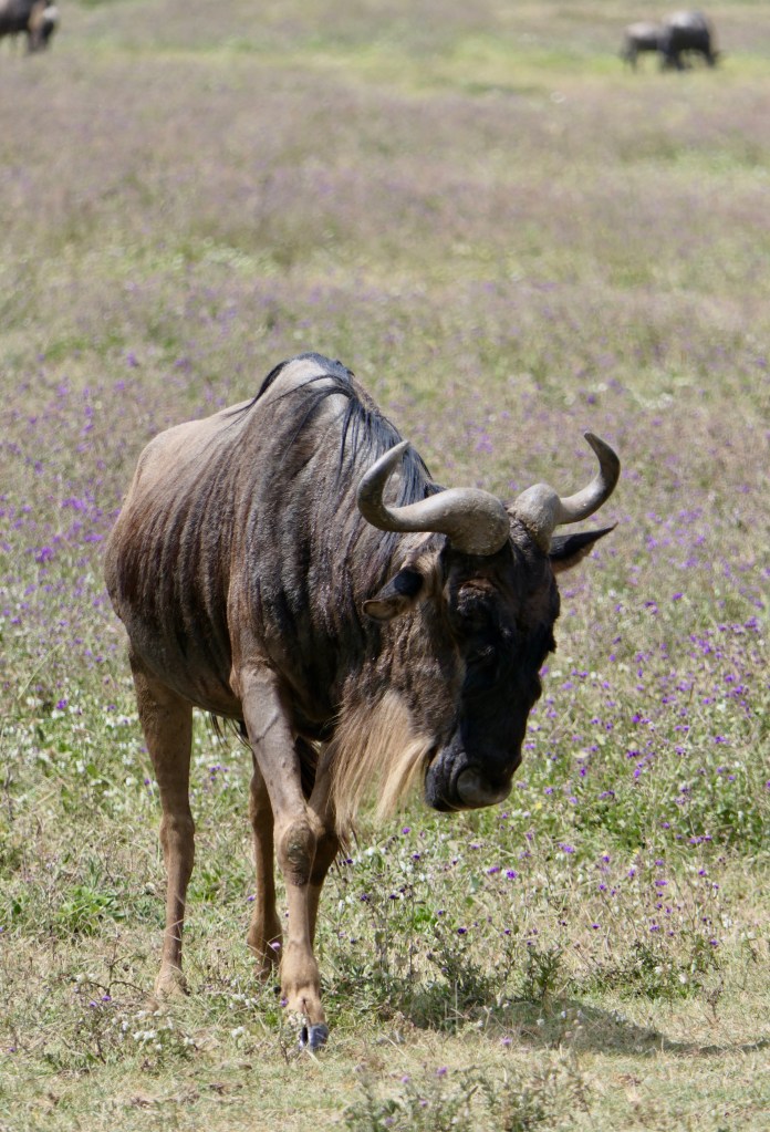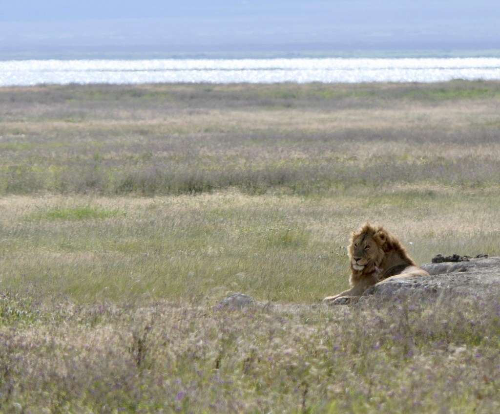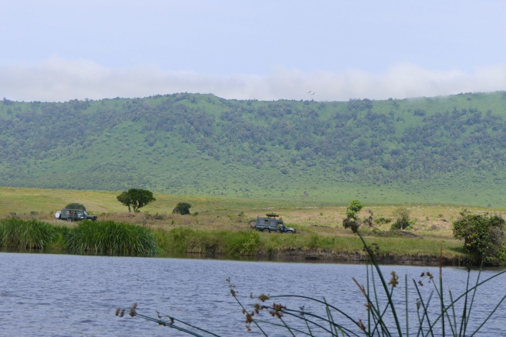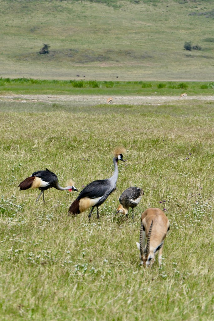 Ez a park olyan, mint az édenkertről készült festmények! Egymástól karnyújtásnyira legelésznek különböző fajtájú állatok, bármerre néztünk, mindenhol mozgott valami! És a környezet! Az apró vadvirágokkal pöttyözött füves síkság világos zöldje, mögötte a kráter oldalának sötétebb árnyalata, fölötte alakját folyamatosan változtató felhősáv, a hihetetlenül kék ég, a napfényben szikrázó tó, komolyan mondom, ez a világ egyik legszebb helye! És ahogy lassan haladtunk az autóval, itt egy csapat gnú, ott zebracsalád, mellettük antilopok, a levegőben csillogó tollú madarak. Távcsővel egy orrszarvú anyukát is láttunk a kicsinyével sétálni. De mutatom a fotókat: