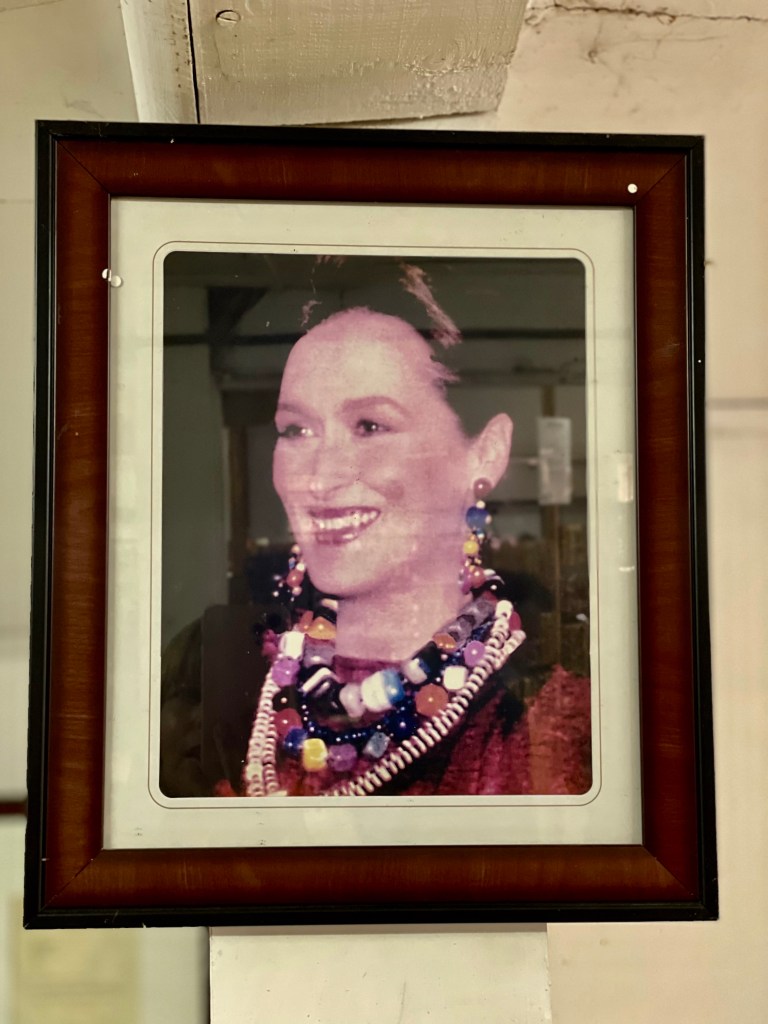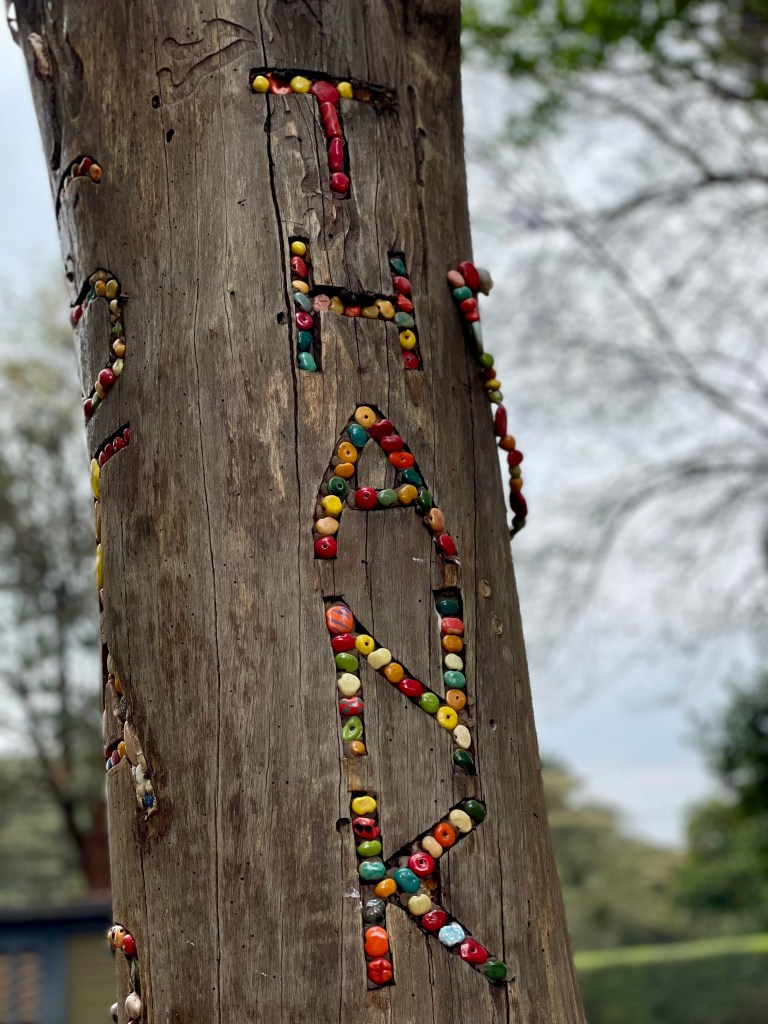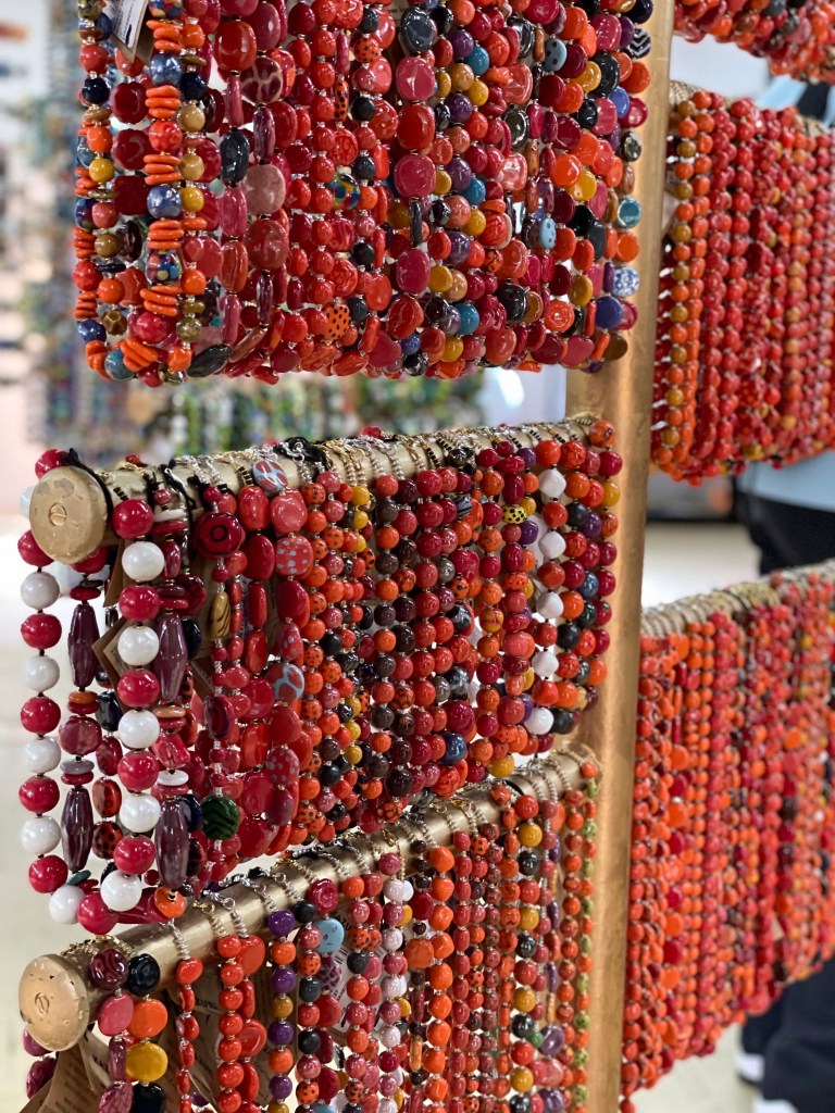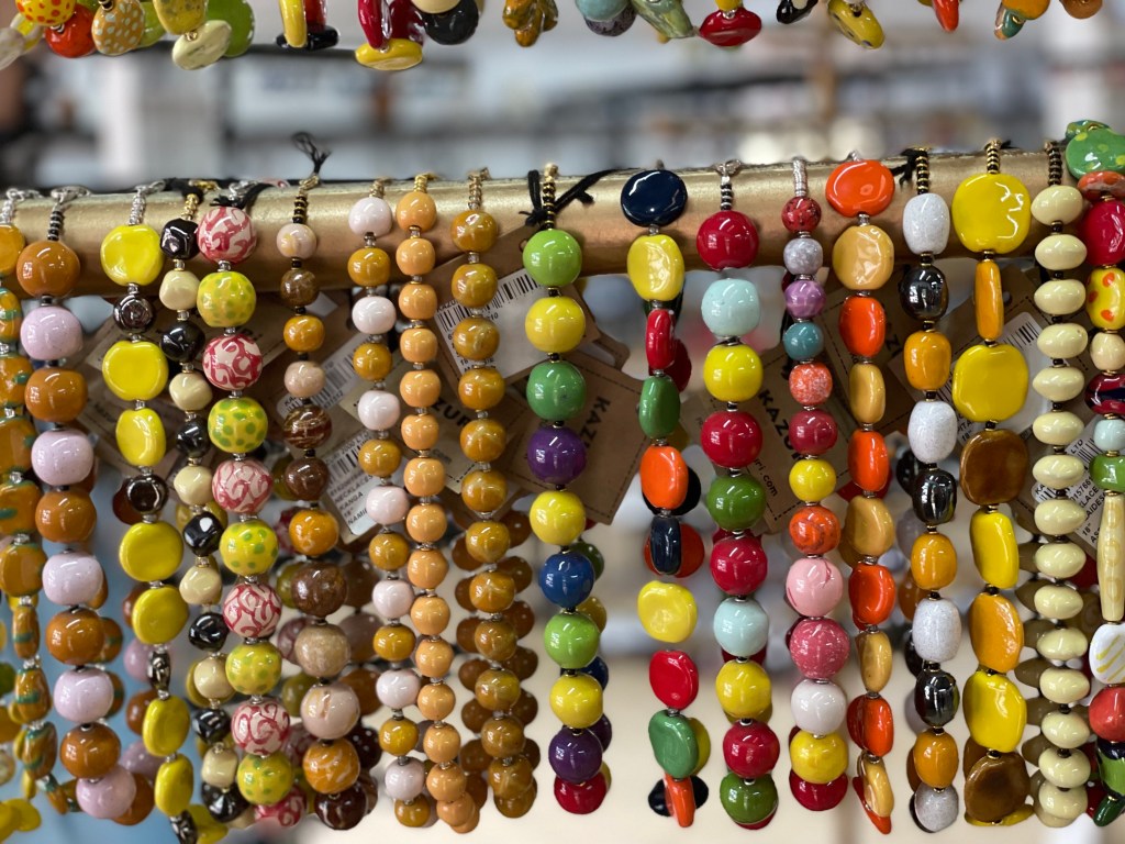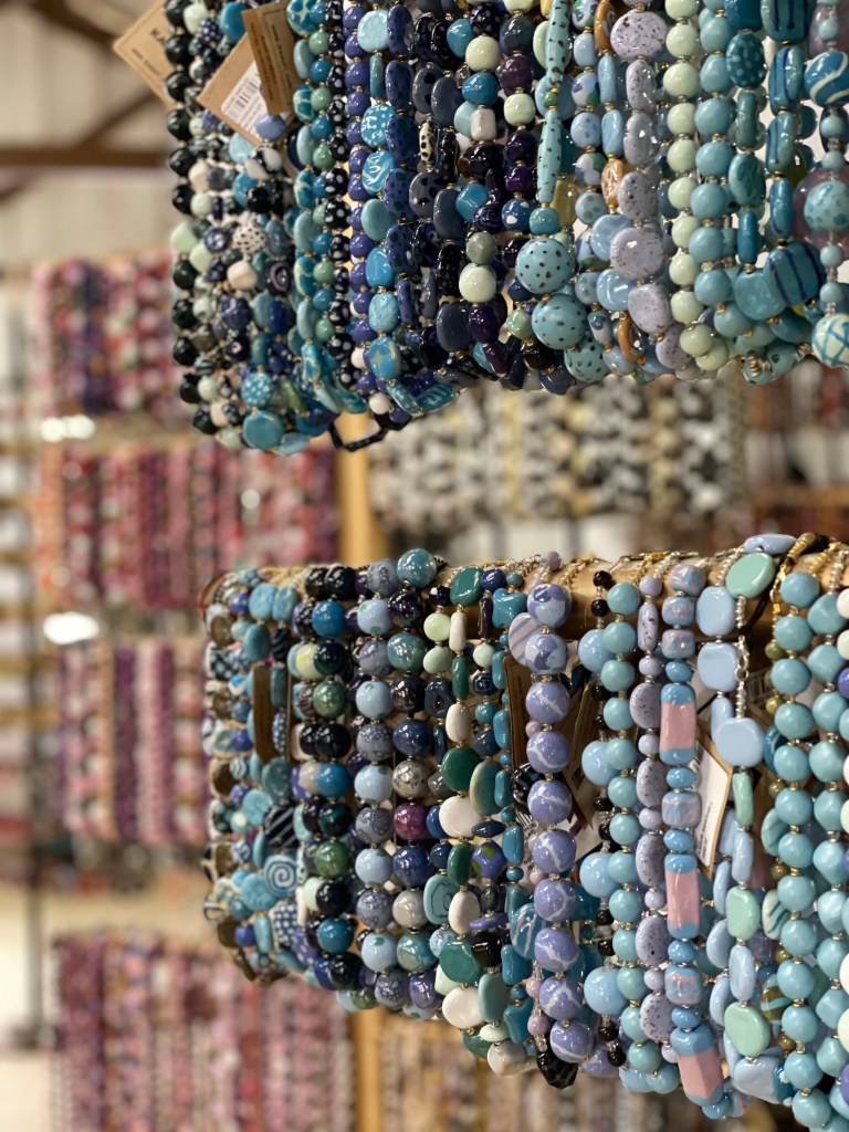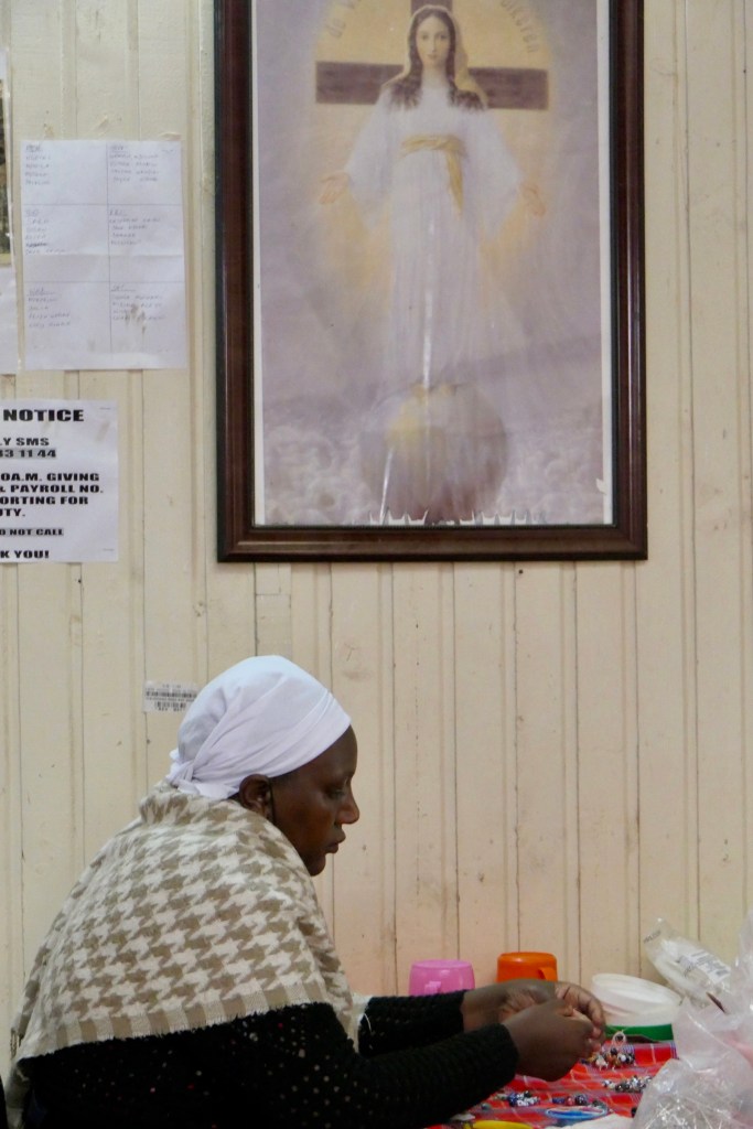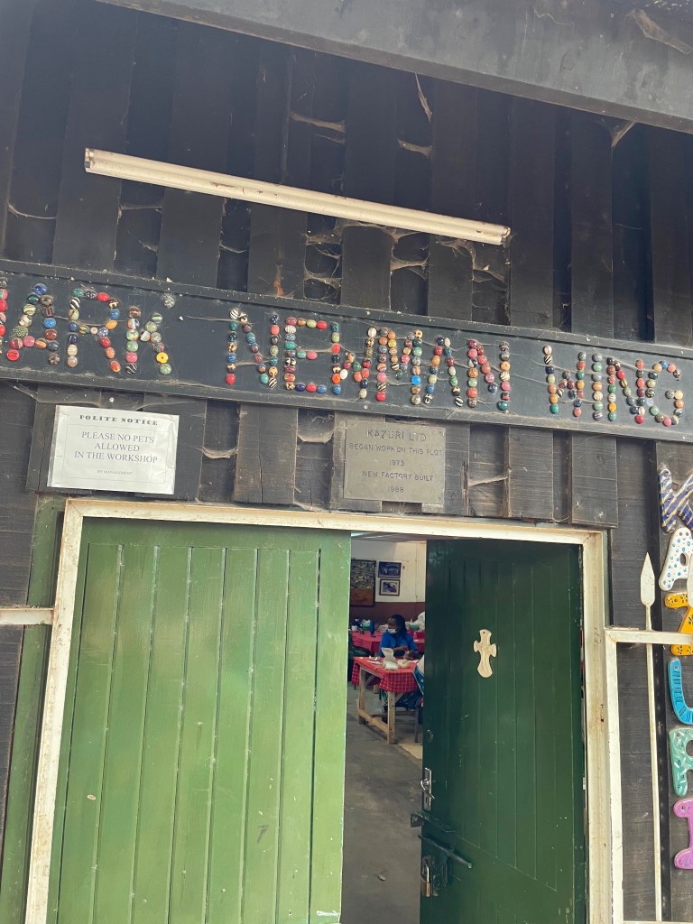 Kazuri egy szuahéli kifejezés, azt jelenti, hogy kicsi és szép. Pont mint az itt készülő gyöngyök! A shop ezerszínű karkötőiből és nyakláncaiból igazán nehéz volt választani, egyik szebb volt, mint a másik. Sokáig nézelődtünk a színpompás, csillogó gyönyörűségek között, melyek mindegyike magán viseli a gondos kezek munkáját. A központi helyet itt is egy Szűz Máriának szentelt oltár foglalta el és a kassza mellett büszkén hírdette egy fotó, hogy a Távol Afrikától című film fogatásán maga Meryl Streep is a Kazuri ékszereit viselte!