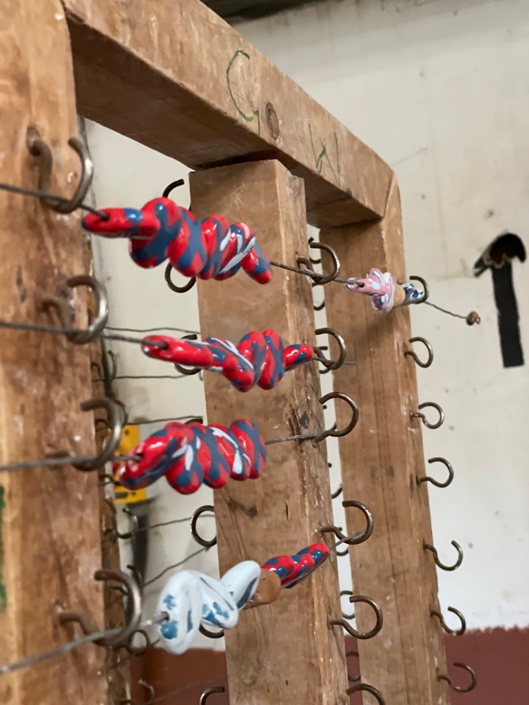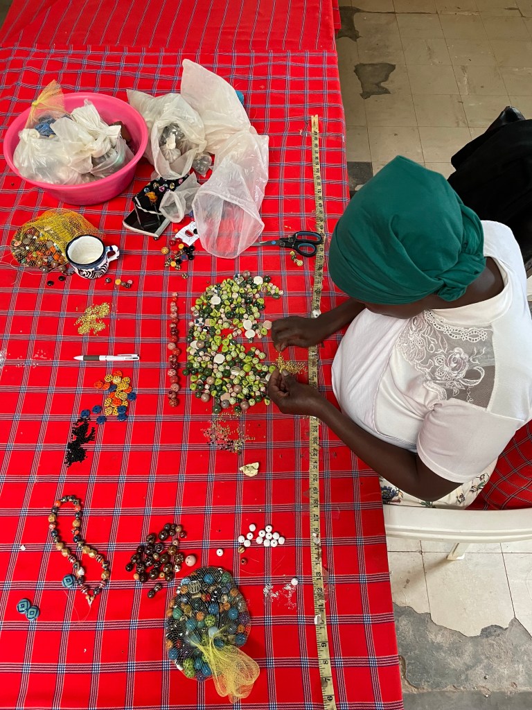 Megnéztük a kemencéket, de a legérdekesebb az a terem volt, ahol egyesével, kézzel festették be ragyogó színekre a kiégetett gyöngyöket. A hosszú asztalok mellett ülve kis birodalmakat alakítottak ki maguknak az asszonyok, a kávés termoszukkal, kendőikkel és számtalan kis edénnyel, ecsettel és szivaccsal. Valamennyien elmélyülten dolgoztak kis szigeteiken. Sokfélék voltak. Fiatalok, idősebbek, hagyományos afrikai hajviselettel, gyöngyökkel díszített fejdíszben és iszlám hit szerint bekötött fejjel, de valamennyien komolyan vették a feladatukat.A falak körös-körül szentképekkel voltak feldíszítve, egy táblán pedig a heti megendeléseket összesítették. A világ minden tájára szállítanak ezekből az egyedi, jó ügyet segítő, csodaszép ékszerekből.