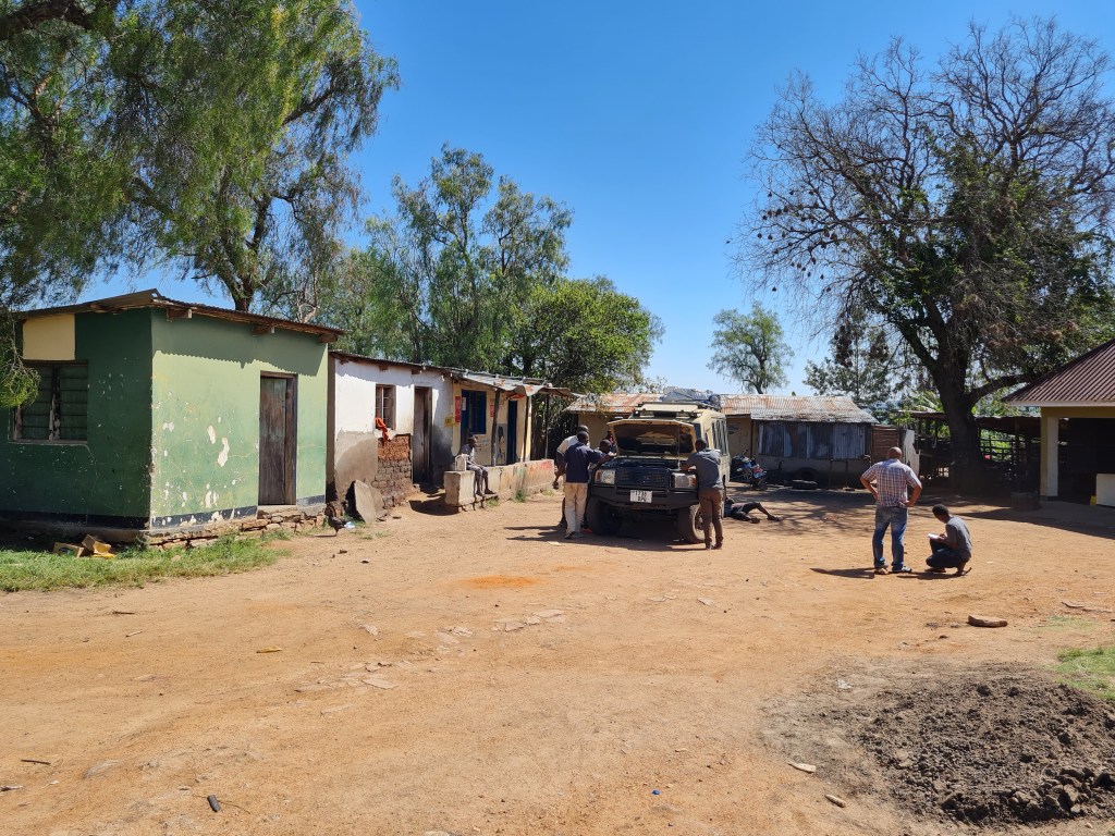 Váratlan kalanddal kezdődött a napunk. Egy elakadt autót húztunk ki a sárból, számtalan összeverődött helyi fickó segítségével. Rejtély honnan kerültek elő a kíváncsiskodók arról a végtelen pusztáról, amerre jártunk. Ettől a vontatástól fura hangja lett a kocsinknak, ezért a legközelebbi településen beugrottunk egy autószerelőhöz. Tamás, a vezetőnk azt mondja, hogy Afrikában egy kalapáccsal bármit meg tudnak szerelni és így is lett. Egy istenhátamögötti falucska sáros udvarán néhány ember körbevette az autót és amíg mi megittunk egy kólát a kocsmában, addig megjavították a kocsit.