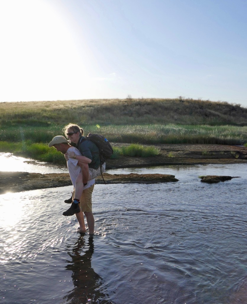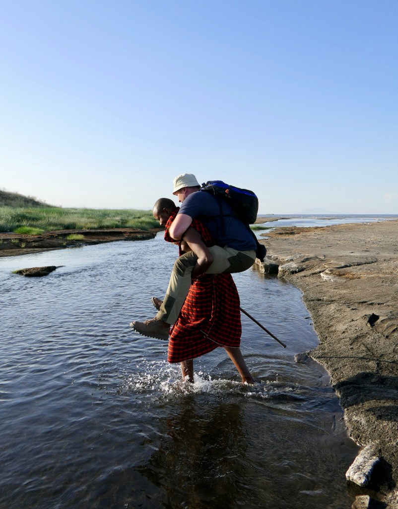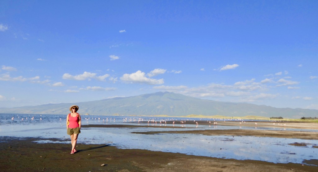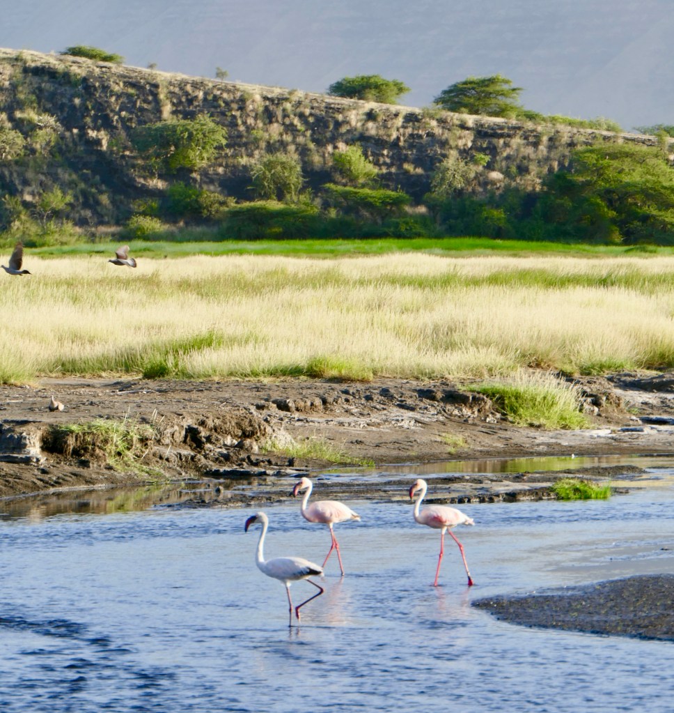 Kinyújtóztattuk elgémberedett tagjainkat és már elénk is toppant egy alacsony termetű, mosolygós maszáj vezető. Az ő kíséretében indulunk el a tópartra. Alig várom, hogy közelről láthassam a flamingókat! Harsogó zöld sásféle között kanyarog az ösvény, mintha egy idegen bolygón járnánk, annyira szokatlanok a színek és az árnyak. Át kell kelnünk egy patakon is, melynek a víze meglepően meleg. Volt aki lábon, volt aki háton jutott át rajta 🙂