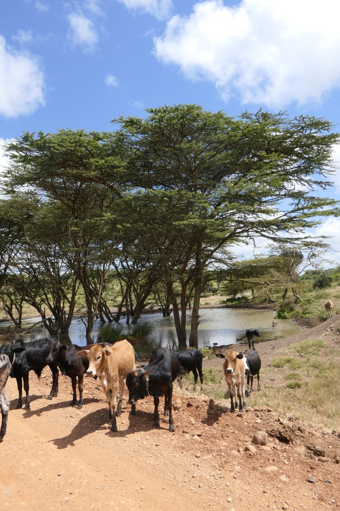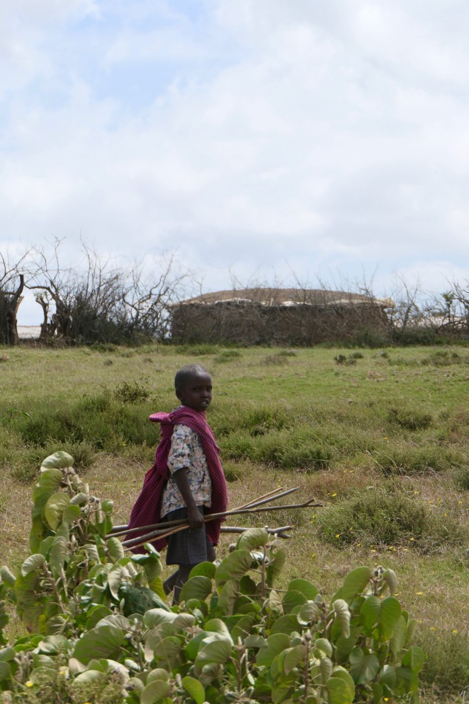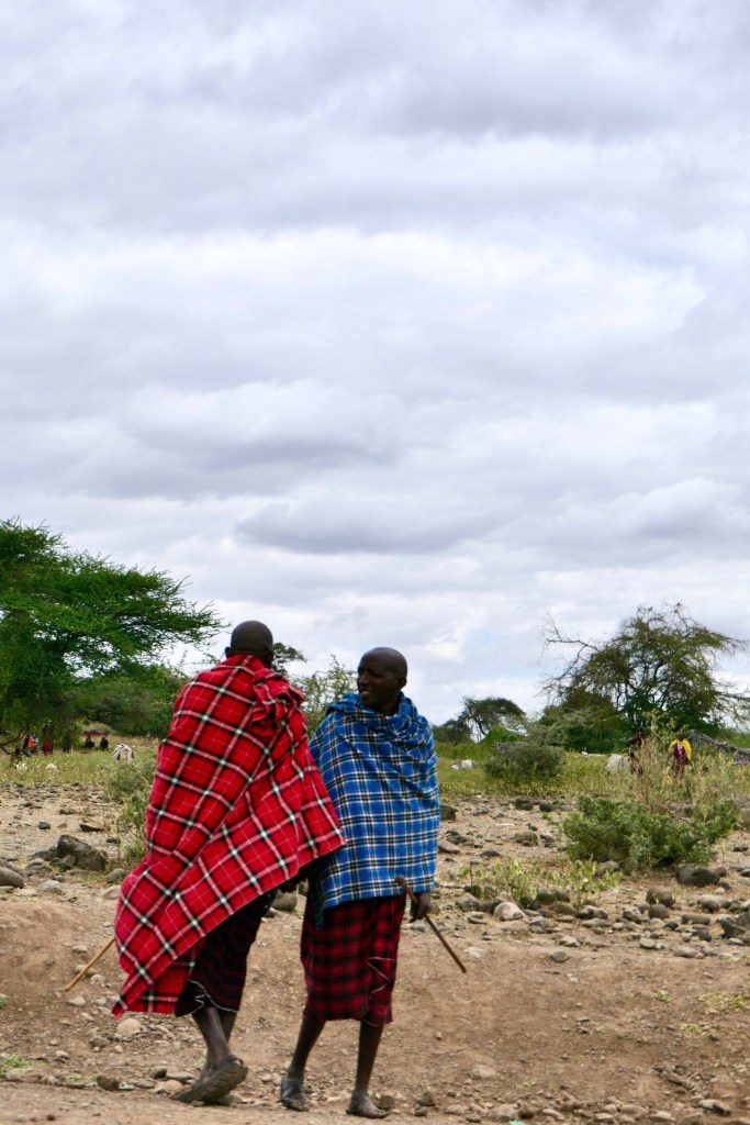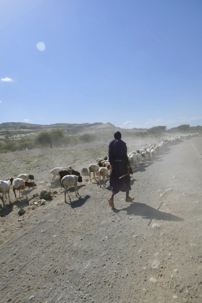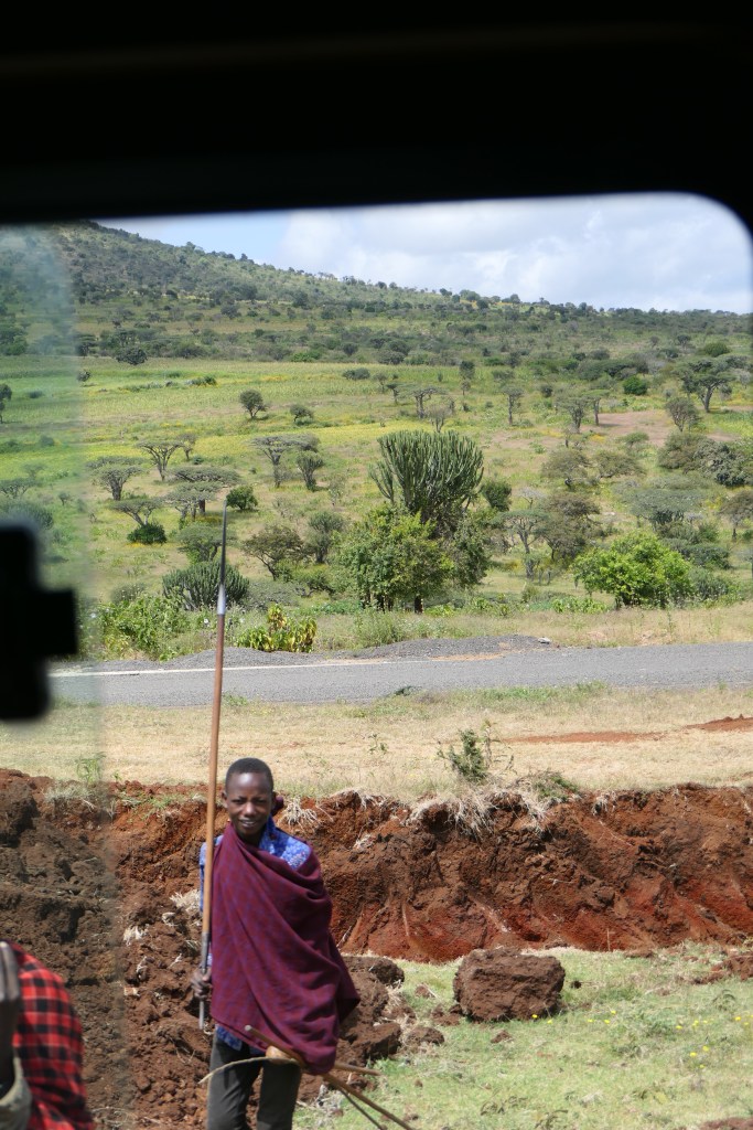 A poros sárga út két oldalán sárból tapasztott kunyhók, bozótokra aggatott, szélben lebegő színes ruhák, óriási kaktuszok, kékes levelű aloe bokrok, nyúlánk szizál pálmák és vadvirágok, ameddig a szem ellát. Forrón tűz a nap, az ég annyira kék, amilyet talán még sosem láttam. Áthajunk egy vízzel teli árkon, a parton tehenek oltják a szomjukat, a fák ágain majmokat fedezünk fel. És a maszáj pásztorok. Megunhatatlan látvány. Hosszú botjukra támaszkodó éjfekete, nyúlánk alakok, fél vállukon átvetett piros kockás leplük lobog a szélben. Karcsú, színes szobrok a zöld tájban.