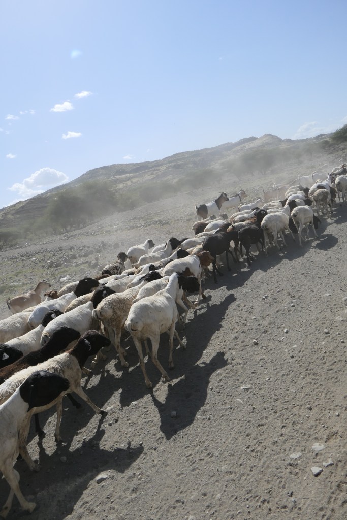 Az “út” kriminális, elképzelhetetlen, kirázza az ember belét. Mindössze két keréknyom a sziklákon keresztül, néha teljesen oldalra dől a kocsi, mindenütt csak kövek, hőség és por. Az út szélén hófehér mosolyok a fekete arcokban, integetnek, nevetnek felénk. Sót gyűjtöttek, azt árulják az út mentén. Nem sok jármű fordul meg errrefelé.