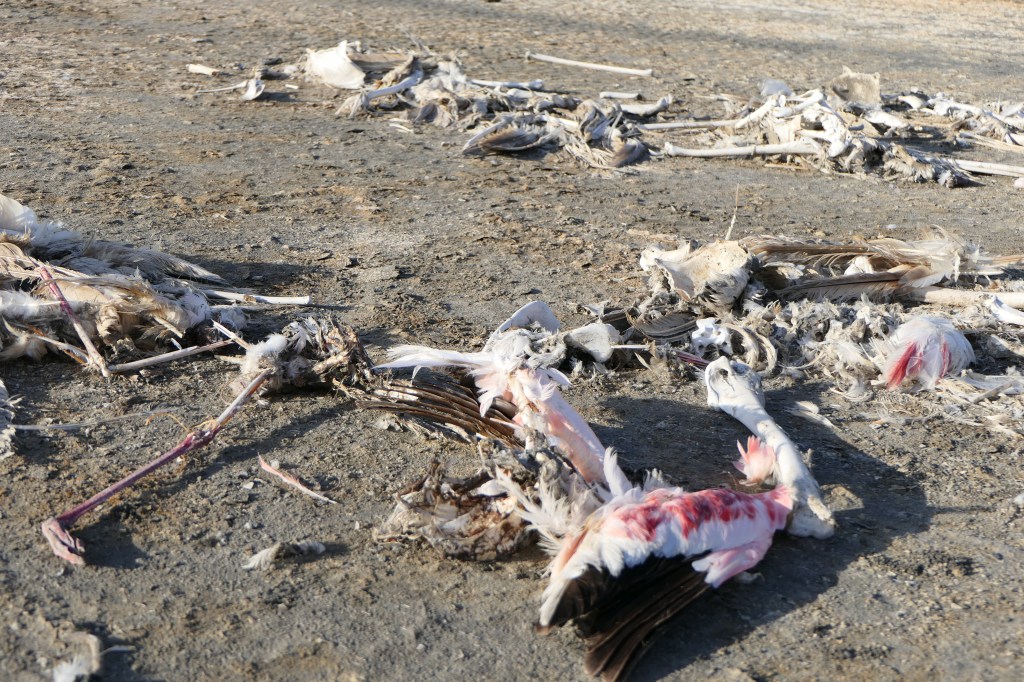 A túlparton döbbenetes látvány fogad bennünket! Tucatnyi halott pelikán és flamingó teteme hever a lábunk előtt! Vezetőnk szerint a szélsőséges éghajlat miatt nem találtak elegendő táplálékot. Az egész partszakaszon elhullott állatok hevertek!