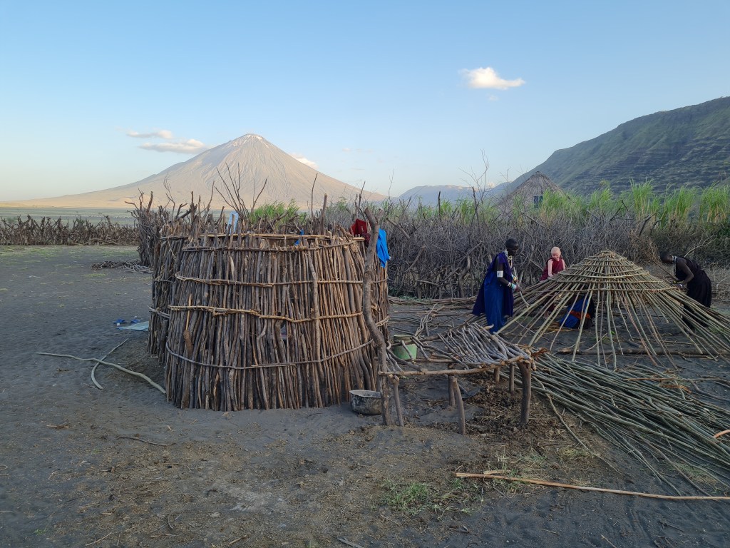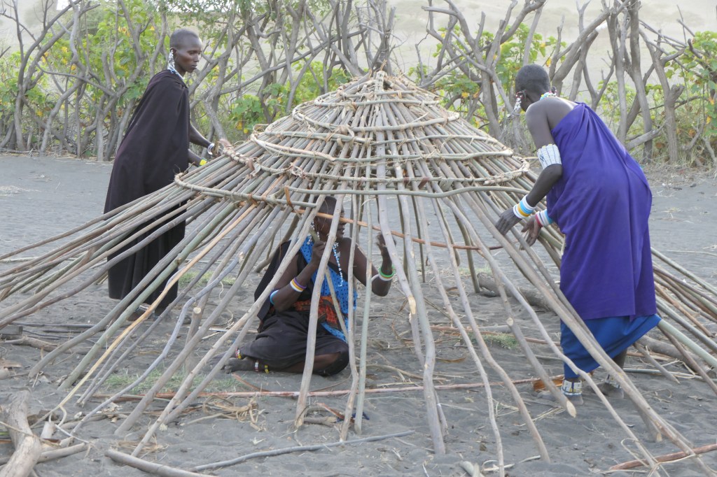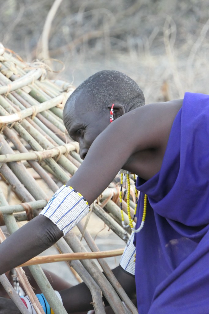 Odakinn új ház készül éppen. A maszájoknál a házépítés az asszonyok feladata. A földbe leszúrt ágakat sárral és marhatrágyával tapasztják össze. Ha egy férfinek több felesége is van, akkor valamennyiüknek külön ház dukál. Az első, legfőbb feleség háza mindig a bejárattól jobbra áll. Rettentő érdekes volt figyelni, hogyan törik megfelelő méretűre az ágakat és hogyan illesztik össze szép formájú tetővé. Az asszonyok néma csöndben tették a dolgukat, persze lehet, hogy csak a mi társaságunk feszélyezte őket.