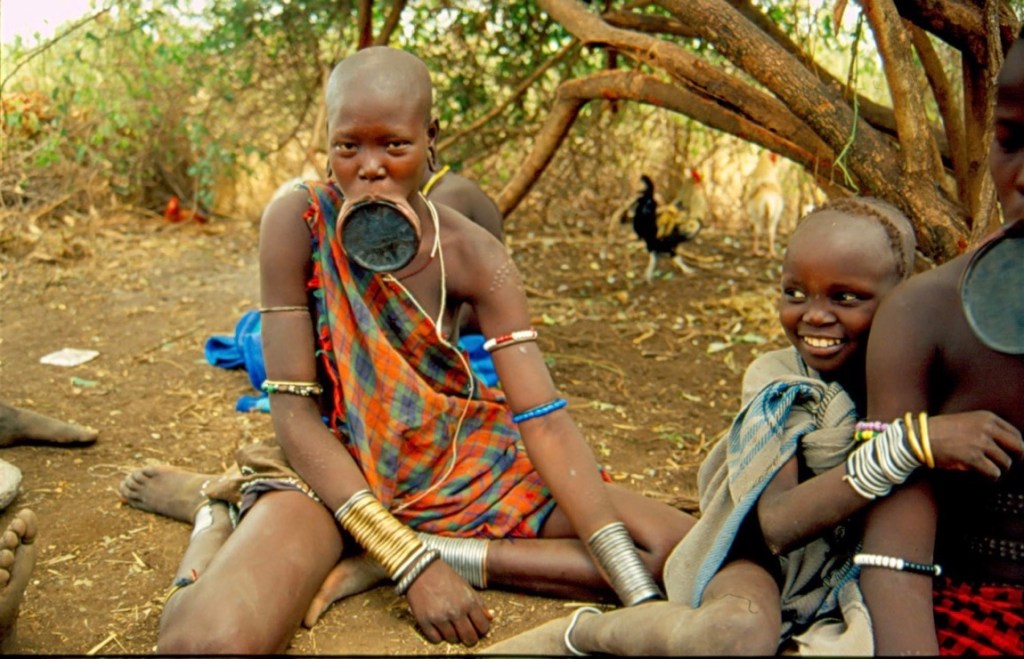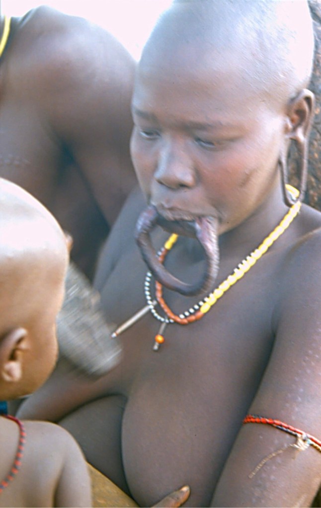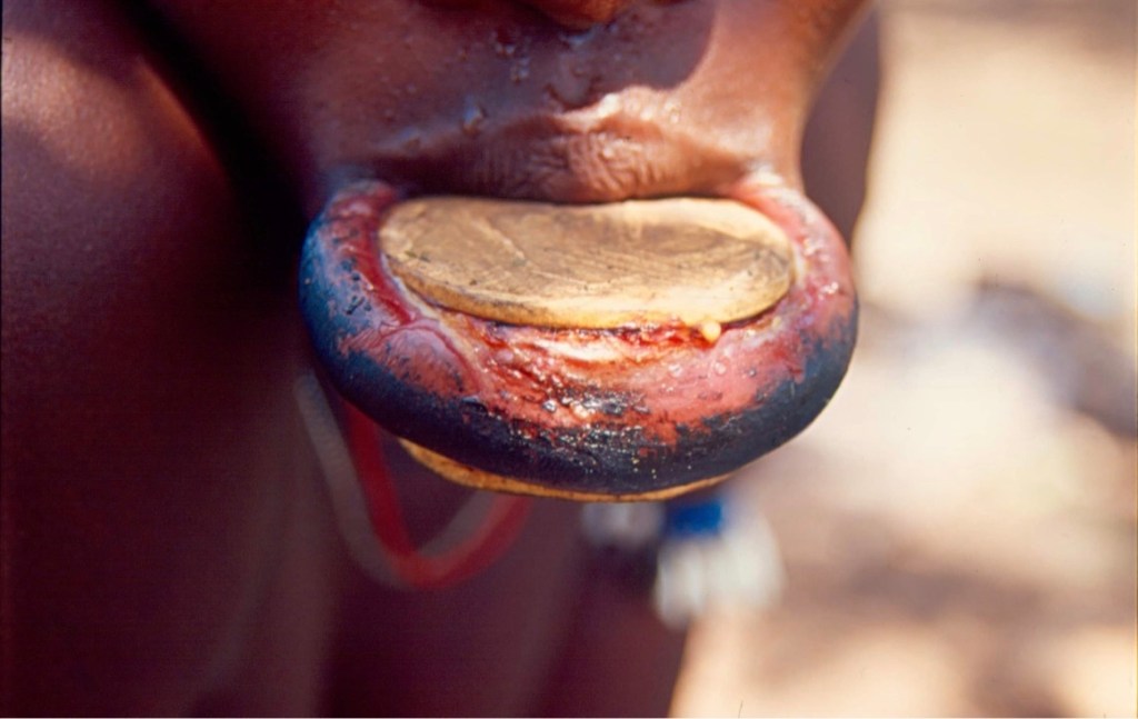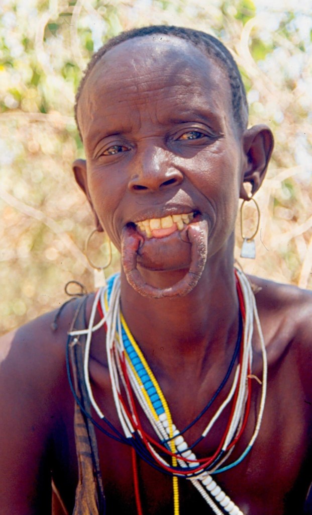 Több afrikai és dél-amerikai törzsnél dívik ez a szokás. A kamaszkorba lépő lányok alsó ajkán pár centiméteres vágást ejtenek, amibe egy fadarabot feszítenek. Néhány hét után, ha begyógyult a seb, nagyobbra cserélik a fa pecket, egészen addig, amíg akkorára nem tágul a száj, hogy beleférjen a kb 10 cm átmérőjű, gondosan díszített agyag tányér. A megfelelő illeszkedéshez sokszor néhány fogat is el kell távolítani. A legmenőbbeknek 20-25 centiméteres tányér is befér a szájukba! Minnél nagyobb, annál kívánatosabbnak tartják a lányt és annál több marhát fizet az apjának, aki feleségül kívánja venni. A lányok pedig büszkén viselik tányéros ajkukat, amivel sem beszélni, sem enni nem tudnak.