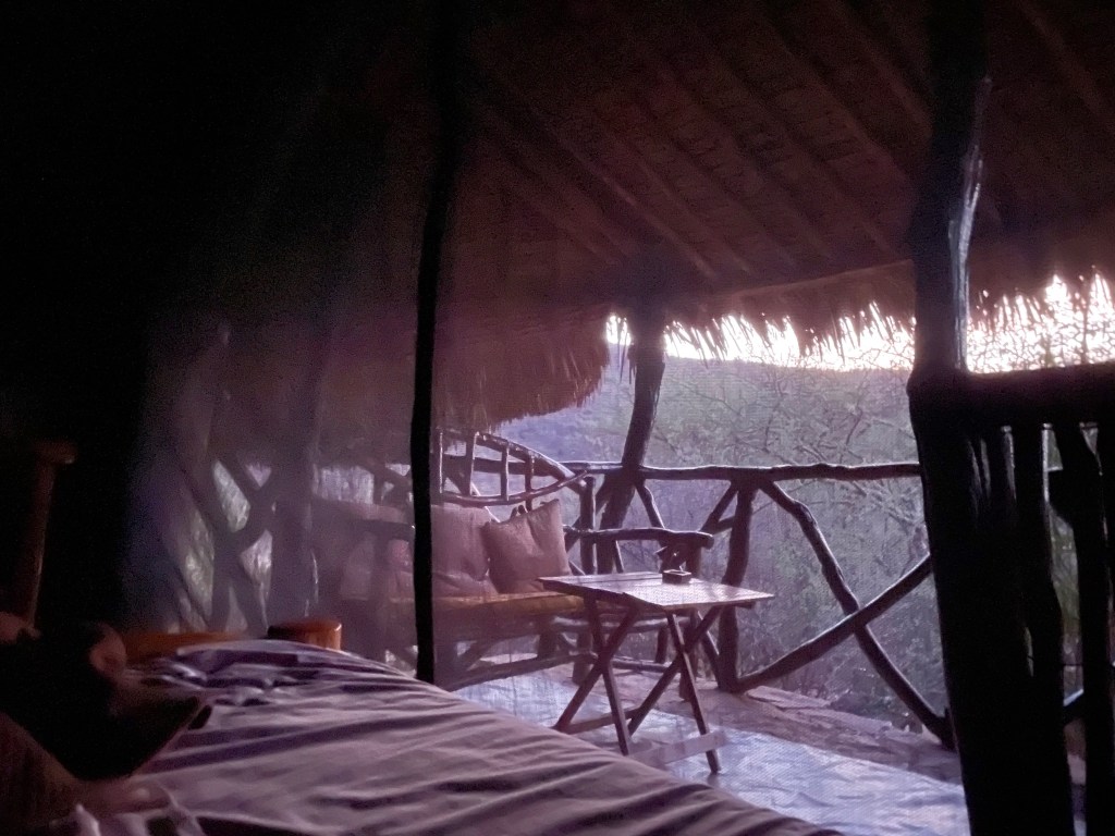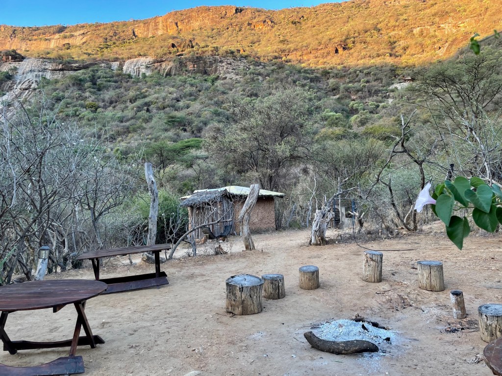 A hegyoldalban álló szafari sátrunk nem volt elkerítve, a bozót mélyén laktunk. Felettünk sziklás hegytető, körülöttünk bozóterdő. Vizet egy közeli forrásból pumpált hozzánk egy szivattyú. Ide jártak vödrökkel a környékbeli falu asszonyai és innen ittak az óvatos gazellák és antilopok is. Áramot egy generátor szolgáltatott, este és reggel 2-2 órán keresztül. Szerencsére a sört valahogy hidegen tudták tartani 🙂