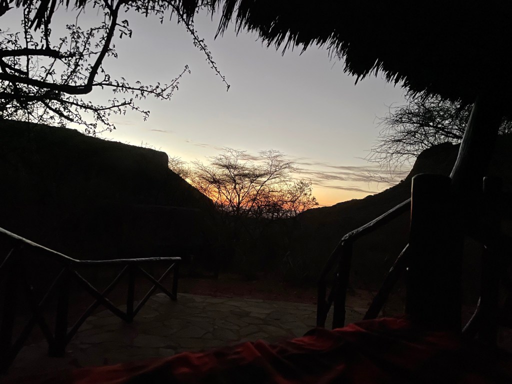Nem sokat aludtam, egész éjszaka fülsértő hangon kiáltoztak a páviánok. Leopárd járt a közelben. Mikor végre elhallgattak, akkor meg a földimókusok kezdtek el motozni, közvetlenül a sátor mellett. Vagy alatt. Olyanok mint a szurikáták, földalatti birodalmuk behálózza az egész lodge területét. Mikor már a madarak is zajongani kezdek, nem bírtam tovább az ágyban maradni. Amúgy is szokatlan volt ilyen helyen aludni, ahol csak egy szúnyogháló van köztem és a külvilág között. Kiültem a sátor elé, beszívtam a langyos hajnal friss levegőjét és a csiripelő madarakkal együtt figyeltem, hogyan világosodik az égbolt alja Észak-Kenya egyik meseszép völgyében.