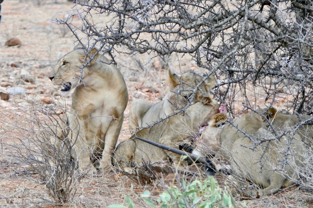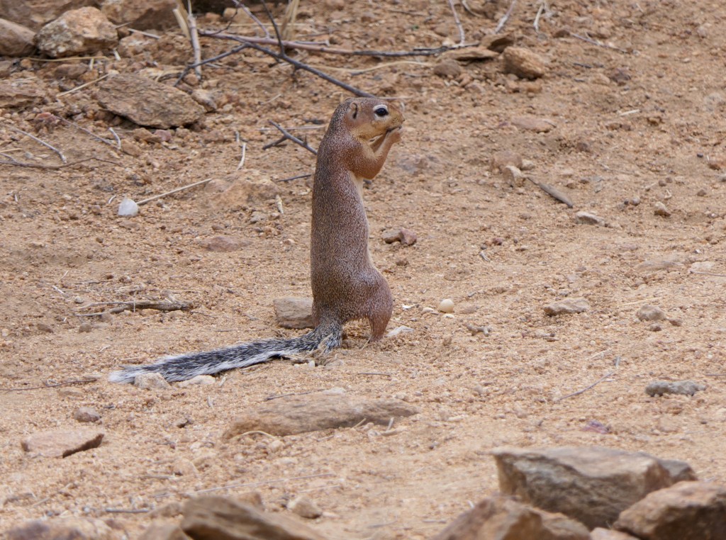 Első reggel sétára indultunk a környéken. Az alacsony, tüskés és száraz növényzet egyáltalán nem nyújtott árnyékot a kíméletlen napsütésben, de legalább a homokos talajon kellemes volt a járás. Csatlakozott hozzánk két fegyveres vadőr is, hogy biztonságban legyünk egy esetleges állattámadás esetén. Annyira békésnek tűnt minden, nem éreztük, hogy bárhonnan veszély leselkedne ránk. De a szabály az szabály.