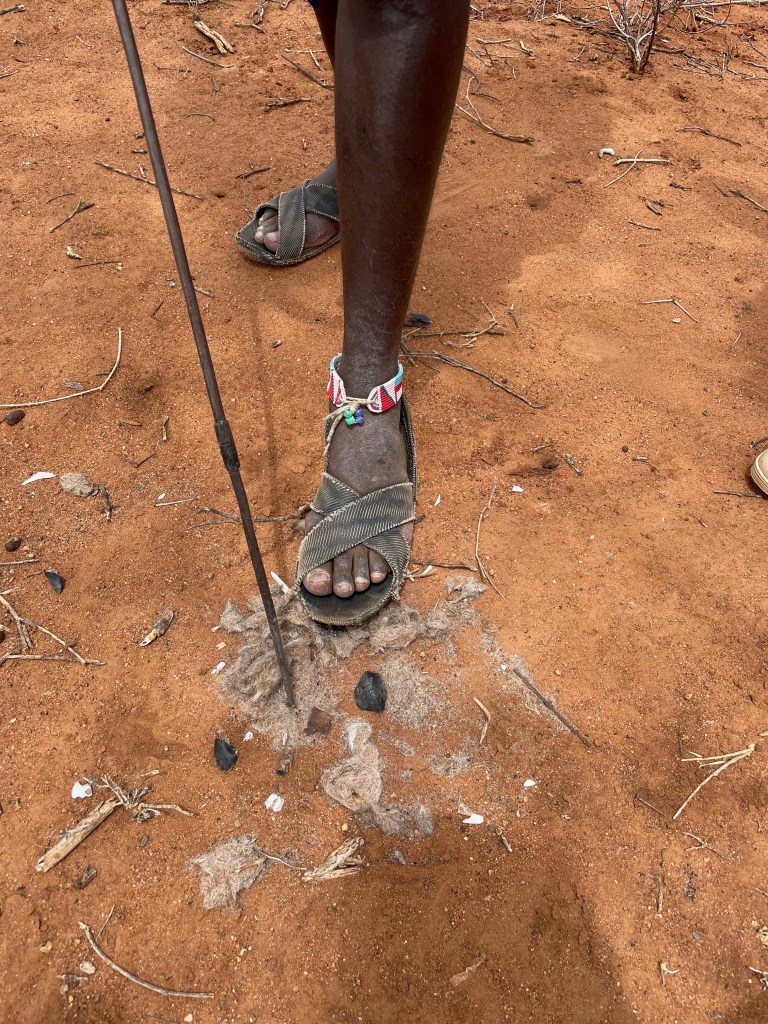 Kereszteztünk egy vadcsapást, ahol az állatok lejárnak a vízhez. Hagyományos törzsi ruhákba öltözött vezetőink könnyedén olvastak a nyomokból. Itt egy elefánt haladt a kicsinyével, amott egy leopárd vonszolta a gazellát, ez pedig hiéna kaki, tele szörrel és csont darabokkal. Iszonyú izgalmas vadállatok földjén járni, még ha nem is látjuk őket! Talán egy közeli fán lapul a leopárd, amelyik itt vonszolta el a zsákmányát! Vagy akár egy elefántcsorda is bármikor előcsörtethet a bozótból!