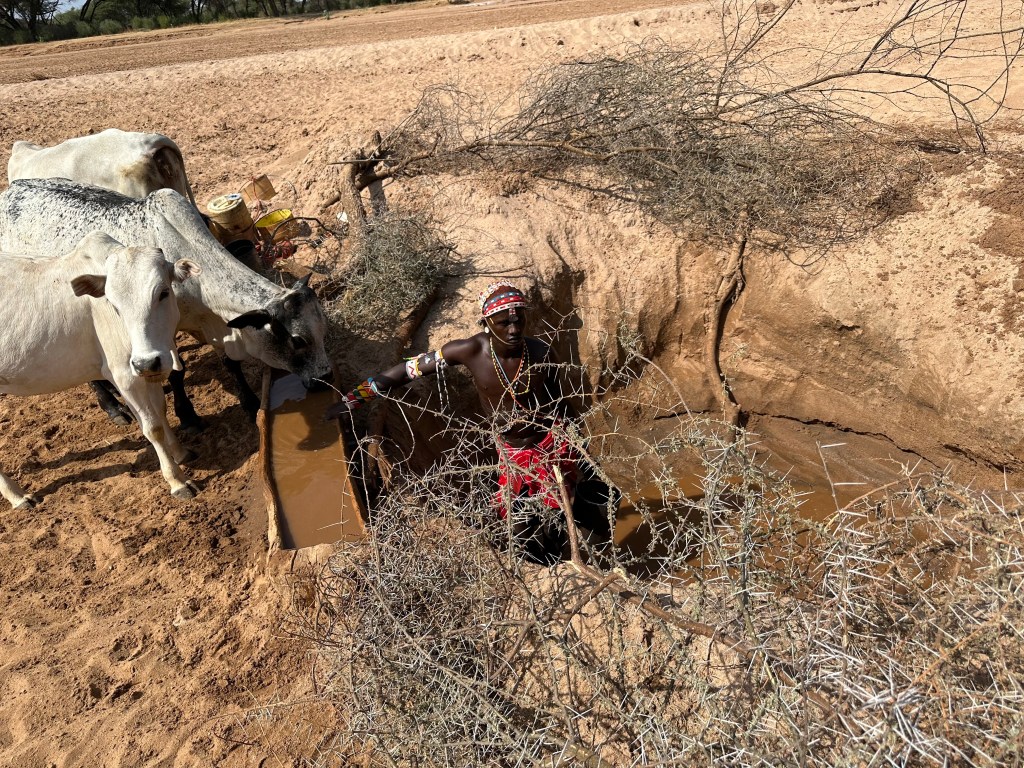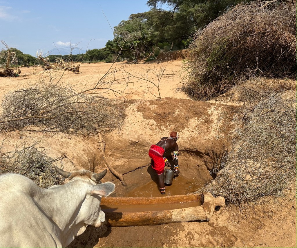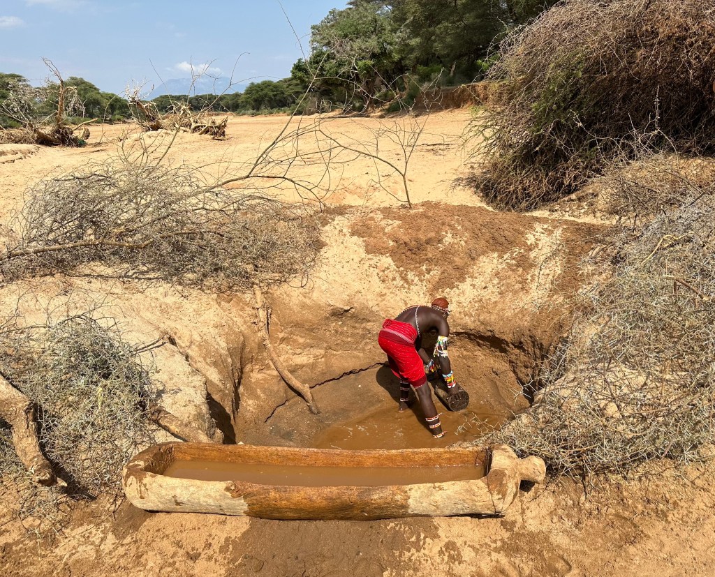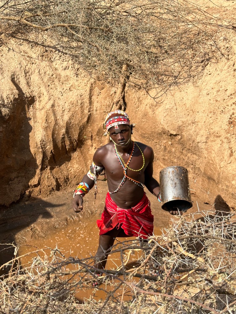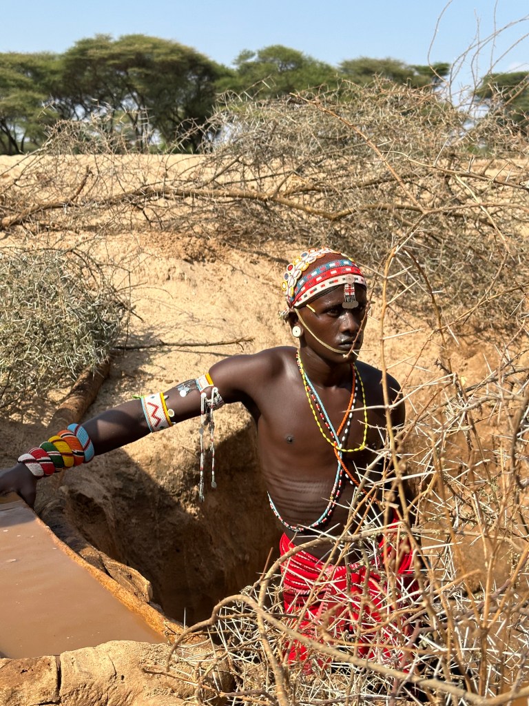A száraz ágakkal bekerített gödör nem túl mély, egy fiatal, csodásan felékszerezett félmeztelen szamburu harcos áll az alján egy vödörrel, azzal meríti a peremen lévő fa vályúba a vízet.